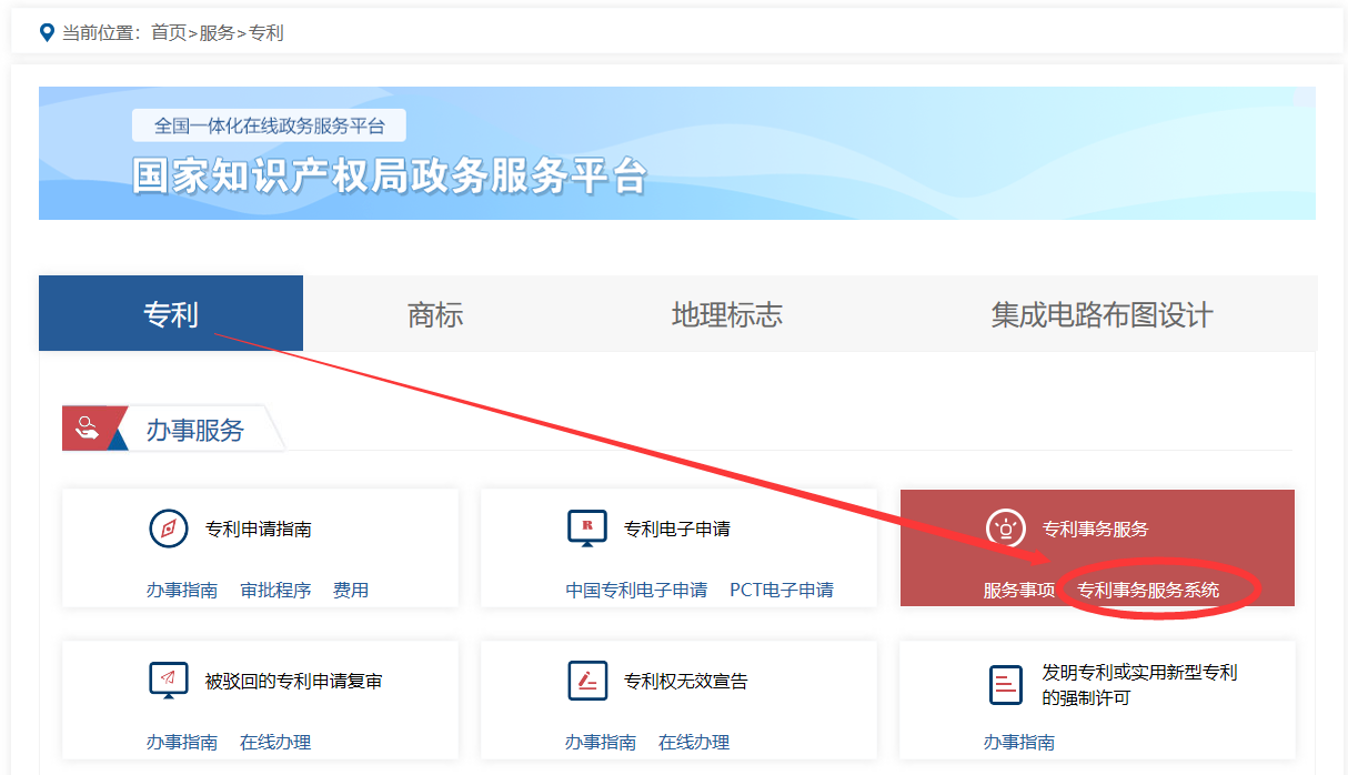 (2)選擇進(jìn)入“專利事務(wù)服務(wù)系統(tǒng)”