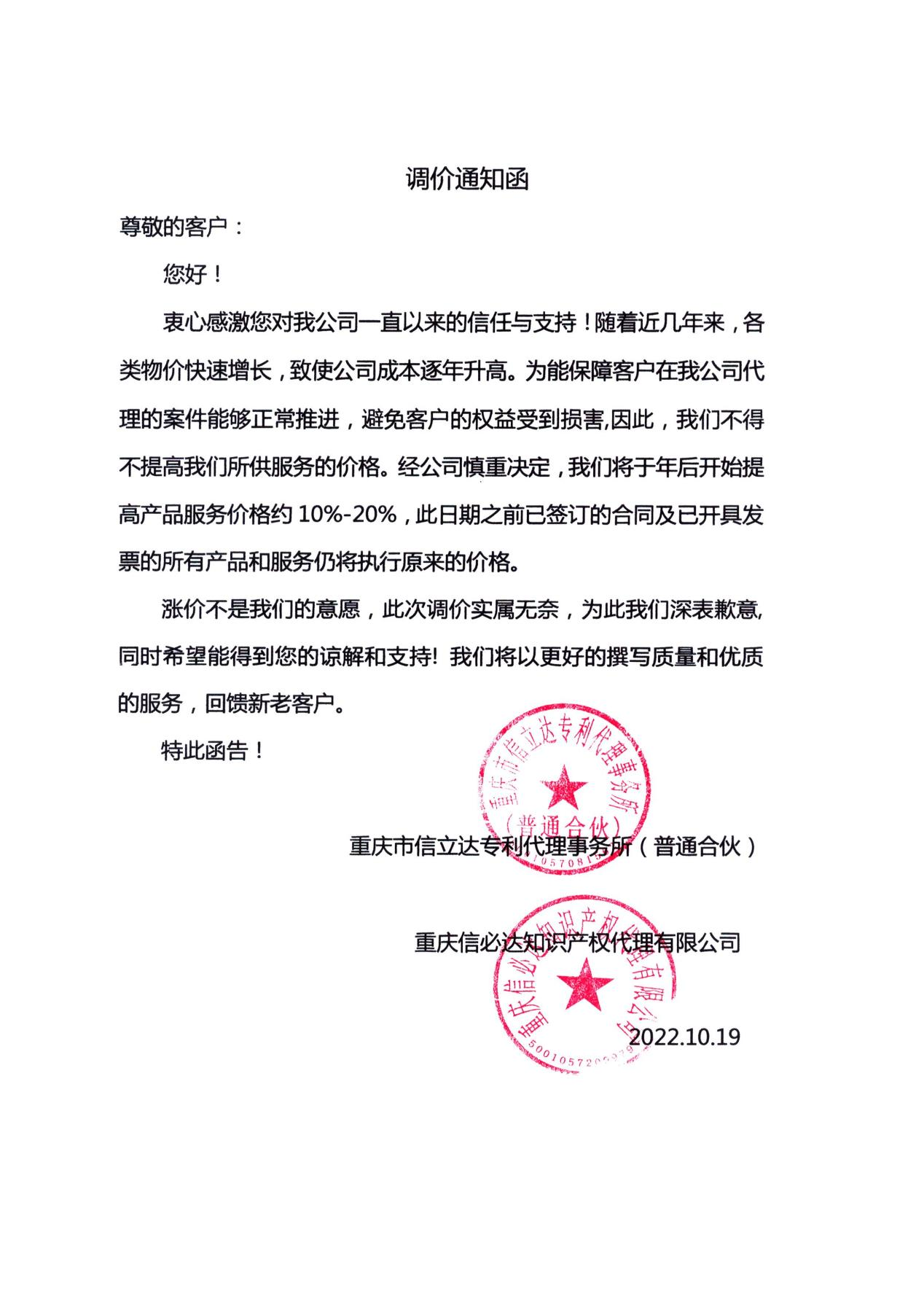 衷心感激您對我公司一直以來的信任與支持!隨著近幾年來,各類物價快速增長,致使公司成本逐年升高。為能保障客戶在我公司代理的案件能夠正常推進,避免客戶的權益受到損害,因此,我們不得不提高我們所供服務的價格。經(jīng)公司慎重決定,我們將于年后開始提高產品服務價格約10%-20%,此日期之前已簽訂的合同及已開具發(fā)票的所有產品和服務仍將執(zhí)行原來的價格。