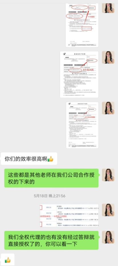 簡單給客戶講解了我們代理人撰寫案子的專業(yè)度,之后把公司合作的授權(quán)比較快的證書發(fā)給客戶看了,客戶對我們的辦事效率給予了肯定