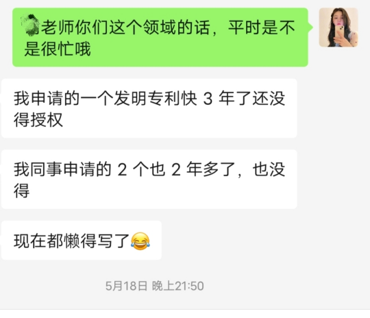 客戶是我在5.5號通過撥打電話,打出來的,最開始客戶說自己暫時(shí)不需要,后期可能需要,也愿意先加微信,加上之后就是簡單的互相問好,自我介紹,公司的介紹,然后就沒有其他的過多的交流了。中途也有給客戶發(fā)我們公司的授權(quán)證書,但是客戶從來都是只讀不回,直到5.18號晚上,給客戶發(fā)了發(fā)明專利預(yù)審6個(gè)月左右下發(fā)結(jié)果的相關(guān)信息。