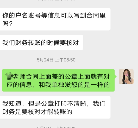 19號一早客戶確定了相關(guān)項(xiàng)目,客戶也很爽快。然后就有一些疑問:是否會保密,價(jià)格等相關(guān)問題,給客戶一一解決疑慮之后客戶基本了解了,也構(gòu)建了初步的信任,只是合同擬定過去之后,需要他們單位法務(wù)審核,單位審核說需要簡單修改,法務(wù)那邊過不了,財(cái)務(wù)審核不過不讓打款,于是就在雙方法務(wù)都認(rèn)可的情況下小小的改動了一下。發(fā)過去之后又有一個(gè)新問題:公章不清晰,公章信息這些看不清楚等,需要我們把公戶信息加在合同里面。