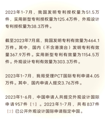 2023年1-7月我國實用新型專利授權(quán)量,同比外下降26.62%,發(fā)明專利同比少上升9.49%,發(fā)明專利授權(quán)率上升高峰期。