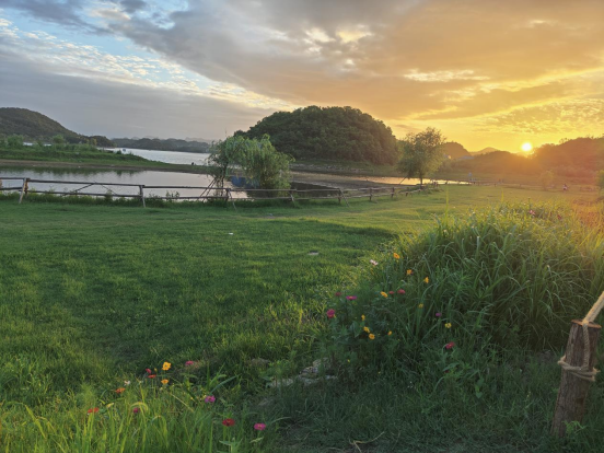 記不太清那天是周幾了,依稀記得那是個(gè)陽(yáng)光明媚的午后,在一聲聲歡呼聲中,大家朝著同一個(gè)方向出發(fā)--我們第一次露營(yíng)的目的地。那是一處被青山包圍的山谷,走進(jìn)去有小湖泊,青草地,小樹(shù)林。