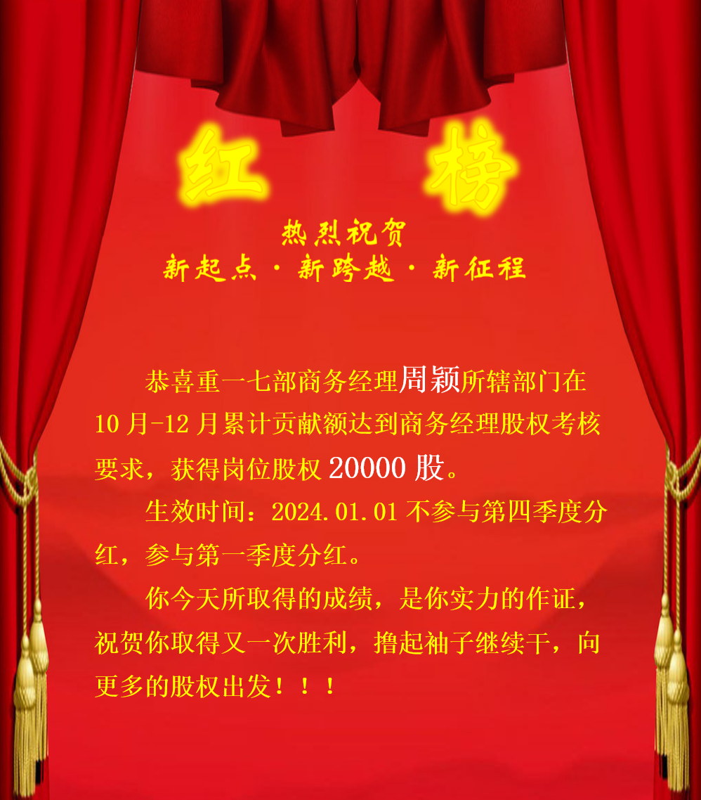 重一七部周經(jīng)理10月-12月成功獲得經(jīng)理崗位股份,在職業(yè)生涯中,晉升和獲得公司股份是一個(gè)重要的里程碑。 這不僅是對個(gè)人能力和貢獻(xiàn)的認(rèn)可,還能帶來一系列積極的影響。