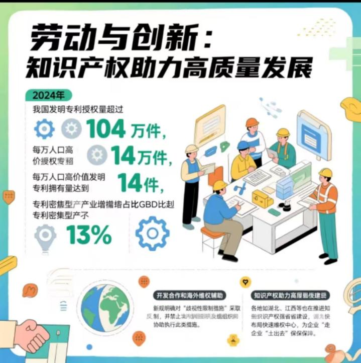 2024年的數(shù)據(jù)顯示,我國發(fā)明專利授權(quán)量超過104萬件,每萬人口高價(jià)值發(fā)明專利擁有量達(dá)到14件,專利密集型產(chǎn)業(yè)增加值占GDP比重超過13%。這些數(shù)字背后,是無數(shù)勞動(dòng)者的智慧成果。我國正加速建設(shè)知識(shí)產(chǎn)權(quán)強(qiáng)國,深化國際合作與海外維權(quán)援助。例如,新規(guī)明確對“歧視性限制措施”采取反制,并禁止境內(nèi)組織協(xié)助執(zhí)行此類措施。各地如湖北、江西等也在推進(jìn)知識(shí)產(chǎn)權(quán)強(qiáng)省建設(shè),布局快速維權(quán)中心,為企業(yè)“走出去”保駕護(hù)航。這些舉措不僅提升了我國在全球知識(shí)產(chǎn)權(quán)領(lǐng)域的地位,也為創(chuàng)新者提供了更加有力的法律支持。